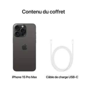 Apple iPhone 15 Pro Max 256 Go – 5G-LTE IP68 Dual SIM – iOS 17 – Titane Noir – Garantie 2ans + Adaptateur Apple Offert