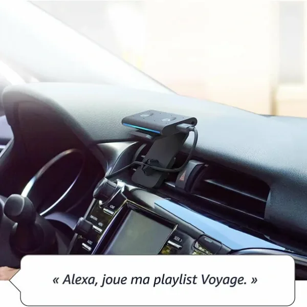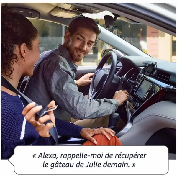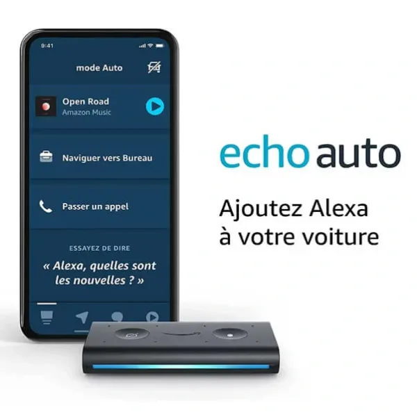 Comment fonctionne Echo Auto ?Echo Auto se connecte à Alexa via l’application Alexa de votre téléphone et utilise les haut-parleurs de votre voiture via l’entrée AUX ou la connexion Bluetooth de votre téléphone. Echo Auto fonctionne également avec le mode Auto dans l’application Alexa. Ce mode permet de transformer votre téléphone en un écran connecté optimisé pour la conduite. Profitez d’un texte de grande taille, facile à lire d’un simple coup d’œil, de boutons tactiles pratiques et de raccourcis vers vos destinations, contacts et médias préférés. Bénéficiez d’une navigation plus facile, restez en contact avec vos proches et divertissez-vous au volant, tout en restant concentré(e) sur la route. Support pour téléphone non inclus avec Echo Auto. |