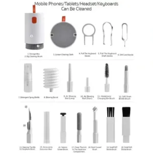 Il est difficile d’accéder à de nombreuses pièces de l’ordinateur portable, du téléphone, du kit mains libres, etc. et elles ne peuvent pas être nettoyées facilement. En fait, sans outils, ce problème est considéré comme impossible. Pour résoudre ce problème, la société Coteetci a conçu le kit de nettoyage modèle 75003, qui nous aide à accéder aux pièces très difficiles et parfois impossibles d’accès, et il est possible de les nettoyer pour nous. Le kit de nettoyage 75003 a des dimensions égales à 61x65x90 mm, que vous pouvez mettre dans votre sac et transporter facilement. Le kit 75003 peut être utilisé pour nettoyer les claviers, les casques Bluetooth, les téléphones portables, les ordinateurs portables, les produits numériques, etc. Avec ce pack, vous n’avez plus besoin d’autres outils de nettoyage. Le kit de nettoyage pack 75003 a la forme d’un cylindre à l’intérieur duquel sont placés les outils. Les composants de ce kit sont les suivants :