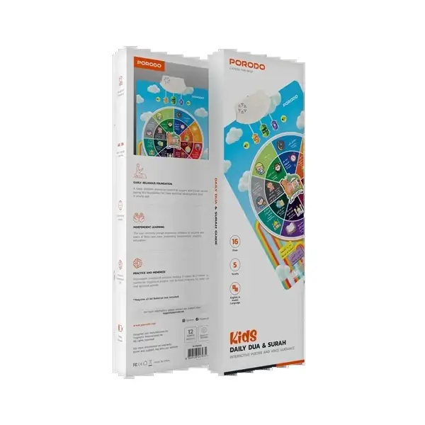 Le Porodo Kids Daily Dua & Surah est un outil interactif et instructif permettant aux enfants d’apprendre des prières essentielles et des versets sacrés de l’Islam. Cet appareil fonctionne avec 3 piles AA (non incluses) et favorise l’apprentissage autonome tout en établissant une base religieuse solide de manière interactive et ludique. Il contient 16 Duas et 5 Sourates en anglais et en arabe, ce qui le rend idéal pour un apprentissage bilingue.