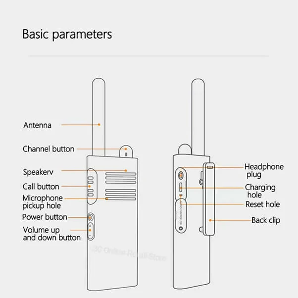 Puissance d’émission 0.5W / 3W Bande de fréquences publique (0,5 W) / segment U amateurType de batterie lithium-ion polymèreCapacité de la batterie 2000mAh (7.4Wh)Température-20 ° C ~ 50 ° CTempérature de charge 0 °C ~ 45 °CInterface électrique Micro-USBParamètre d’entrée 5V1ATension nominale 3.8VSensibilité de réception -122dBm (12dB SINAD)Le temps de charge de la batterie est d’environ 3h Batterie en veille pendant environ 120h (5 jours)Le paquet contient Xiaomi Mijia talkie-walkie Lite, câble de charge USB, manuel d’instructions,